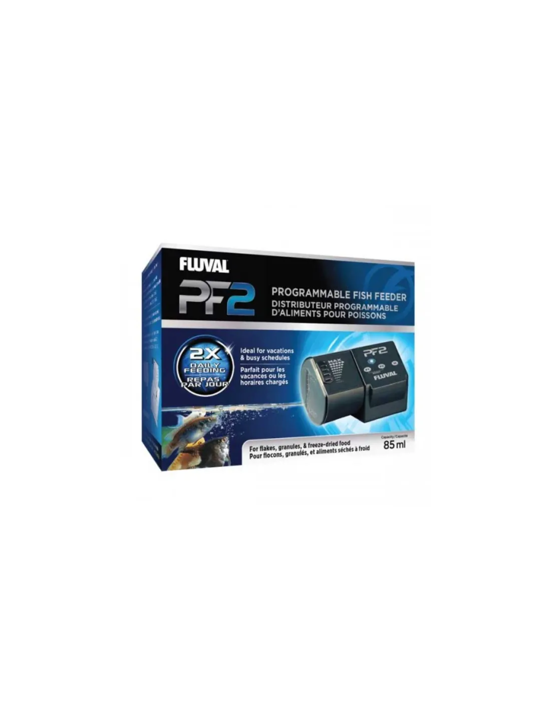 El alimentador programable para peces Fluval PF2 permite mantener un suministro constante de comida incluso si no estás en casa.