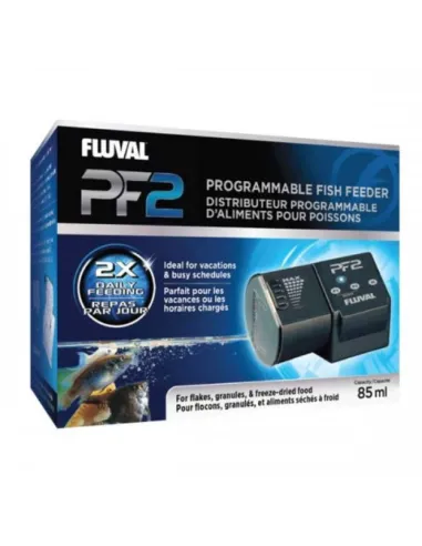 El alimentador programable para peces Fluval PF2 permite mantener un suministro constante de comida incluso si no estás en casa.