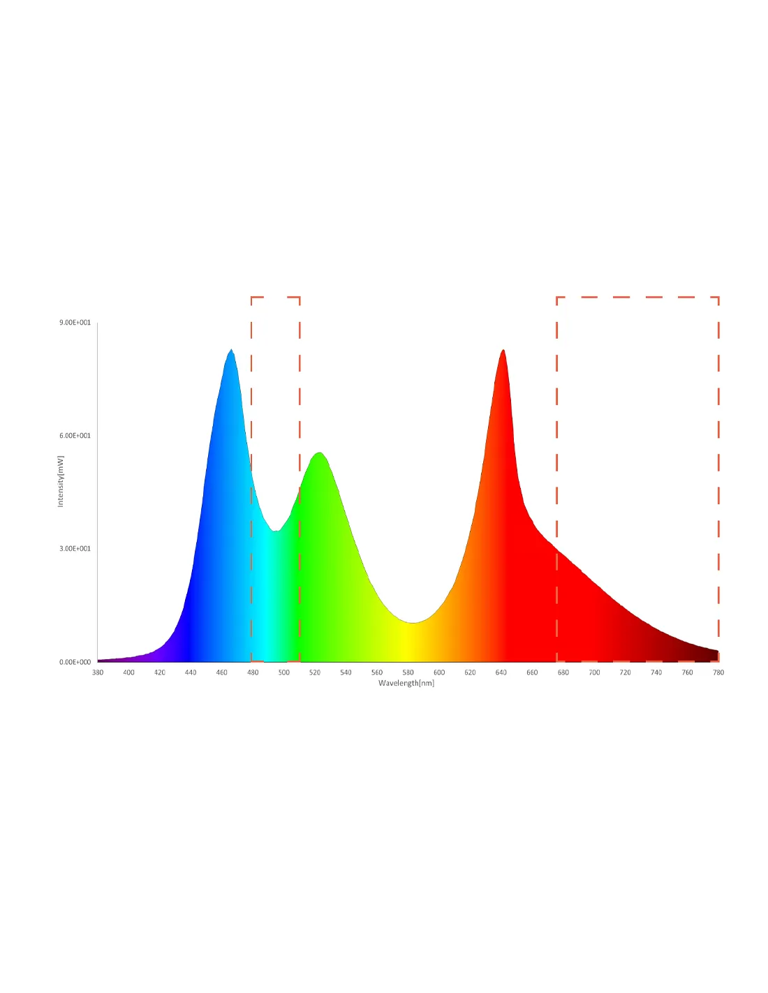 Incorpora no sólo dos colores, azul (464 nm ~ 480 nm) y rojo (617 nm ~ 630 nm), sino también toda la luz necesaria para el crecimiento de las plantas en un solo paquete mediante la elaboración de una combinación de fósforos.