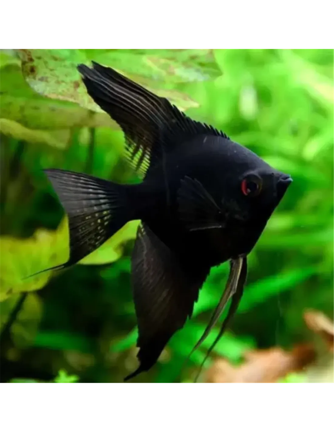 El escalar negro necesita un acuario de al menos 100 litros con una buena filtración y un ambiente bien estructurado. Se recomienda incluir plantas naturales y refugios como troncos o rocas para que se sienta seguro. Los parámetros del agua deben ser estables, con cambios parciales de un 20% cada dos semanas para mantener la calidad del agua. Este pez es mejor mantenerlo en grupos de al menos 4-6 individuos, ya que son peces de cardumen y se benefician de la compañía. Sin embargo, deben evitarse las especies agresivas como los cíclidos más grandes o los peces que muerden aletas.